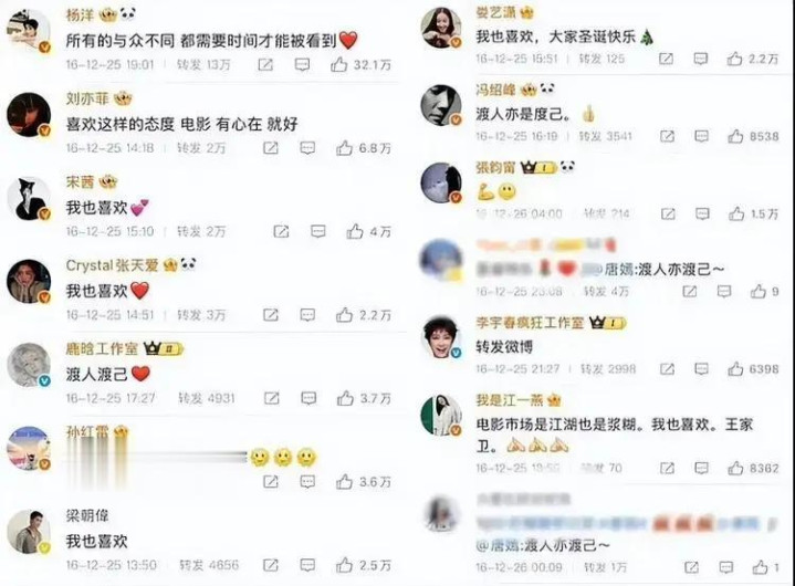 起因发生在2016年,娱乐圈众位明星都跟风表达对王家卫电影《摆渡人》的喜欢,即便这部电影的评分非常低,可明星们还是秉承趋炎附势的态度,生怕得罪这位大导演。